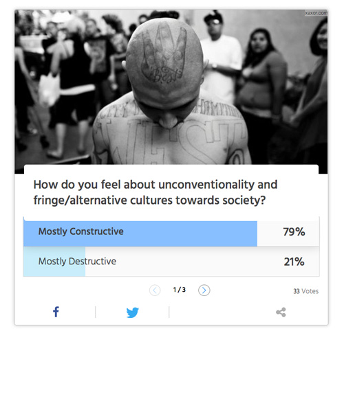 26 out of 33 participants feel that unconventionality and fringe/alternative cultures are mostly constructive towards society while 7 feel that they are mostly destructive.